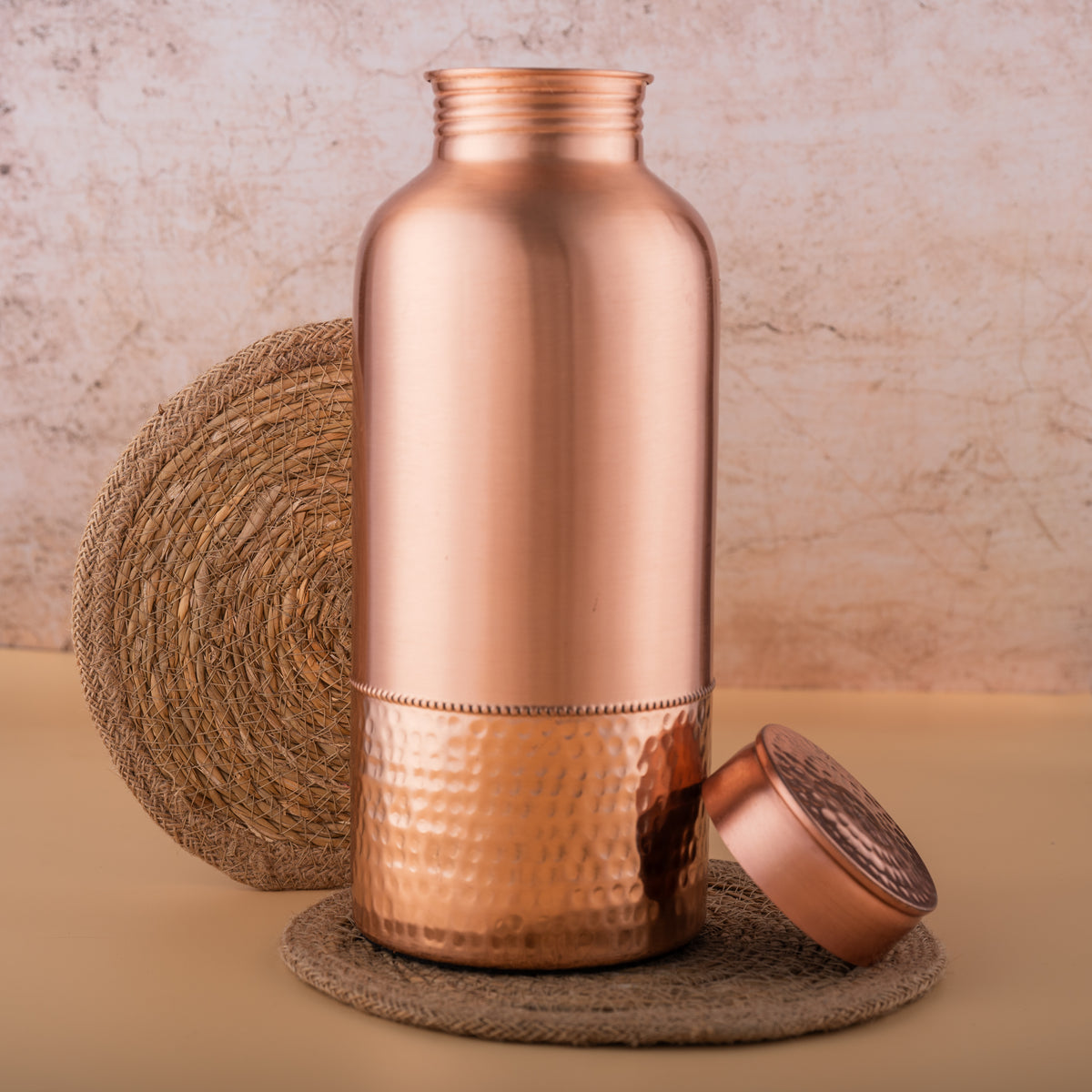 Handcrafted & Elegant Design: Raj Gharana 100% copper water bottle designed by the experienced artician. 2.5 litre copper bottle crafted with glossy hammered finished at bottom which gives it a traditional touch and rest half upper part designed with plain matte finished. traditional Indian craftsmanship make it a stylish and thoughtful gift for friends & family.
