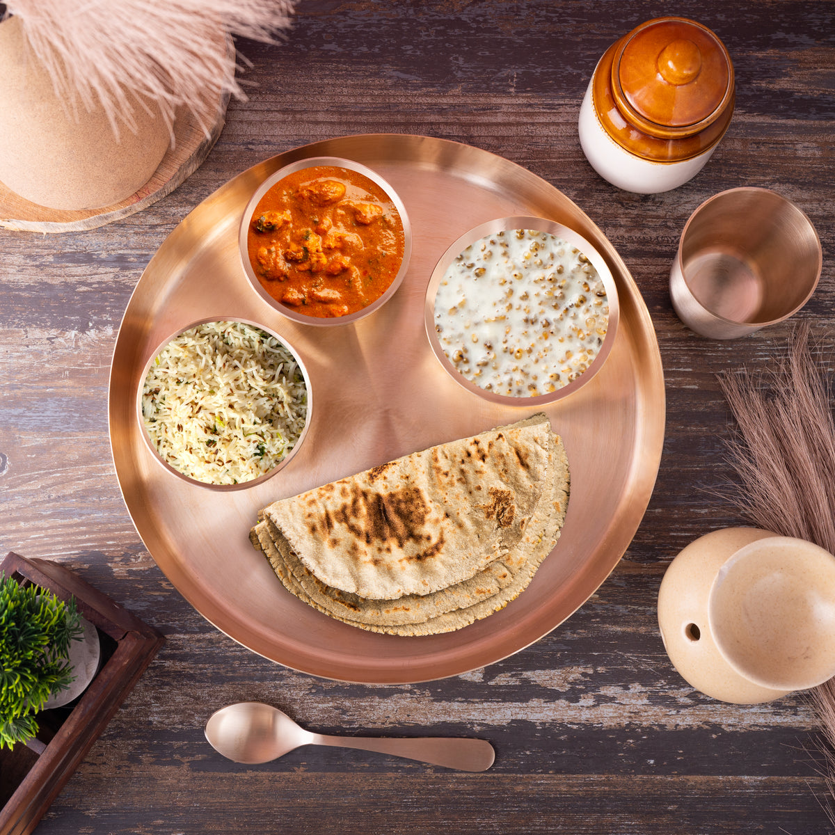 HANDCRAFTED KANSA DINNER SET - Raj Gharana Metals forging Pure bronze utensils and bronze kitchenware items from years of generations, Our Indian handmade bronze dinner set has been crafted by very skilled and professional artisans which is highly durable and corrosion and stain resistant. It is ideal for daily usage to serve any hot, solid or liquid food, dishwasher safe.
