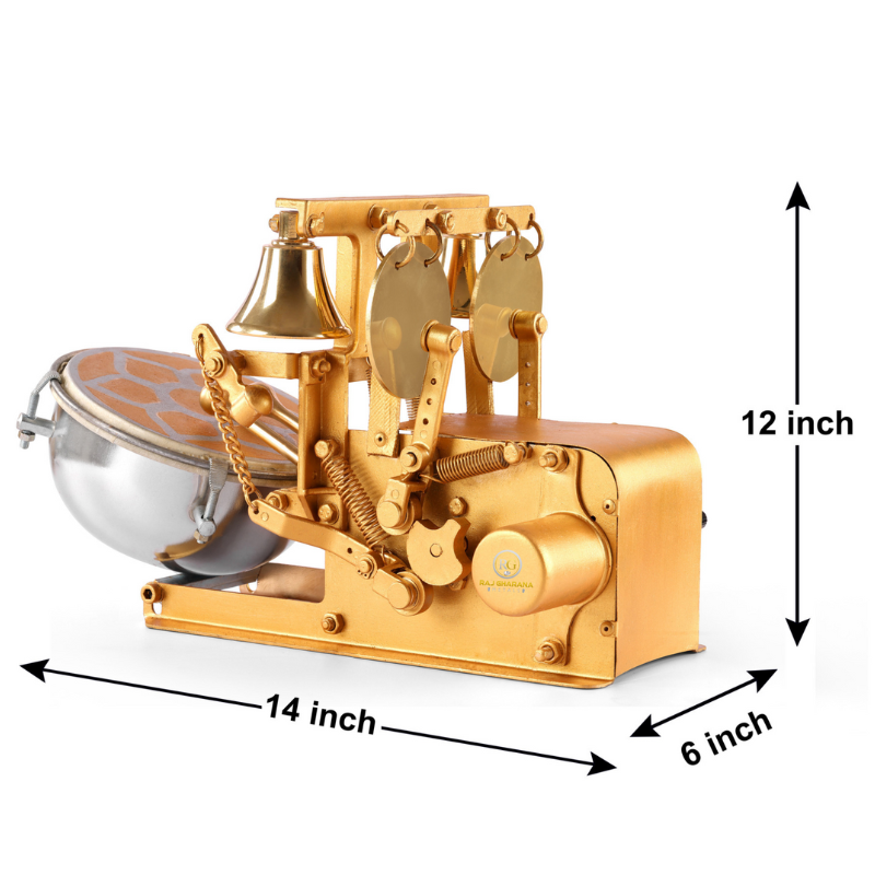 Ergonomic Design: Raj Gharana Aarti Machine is made with 2 Round Bells(Zalar) Made of Brass, 2 Bells(Like Temple Ghant) Made of Brass, and 1 Drum(Nagara). Our pooja machine for home is very compact in size and comes with an adapter which will be plugin while switching on the Aarti machine and Plug out once done, it is safe to use at home, no mess.