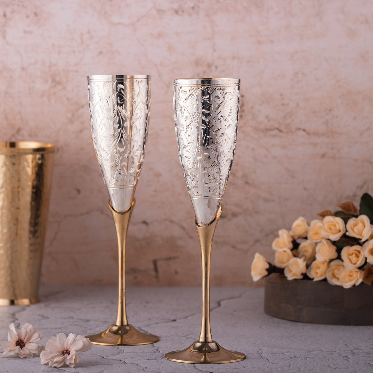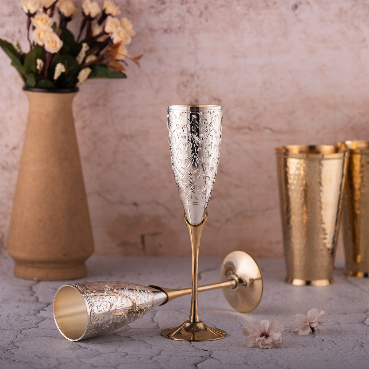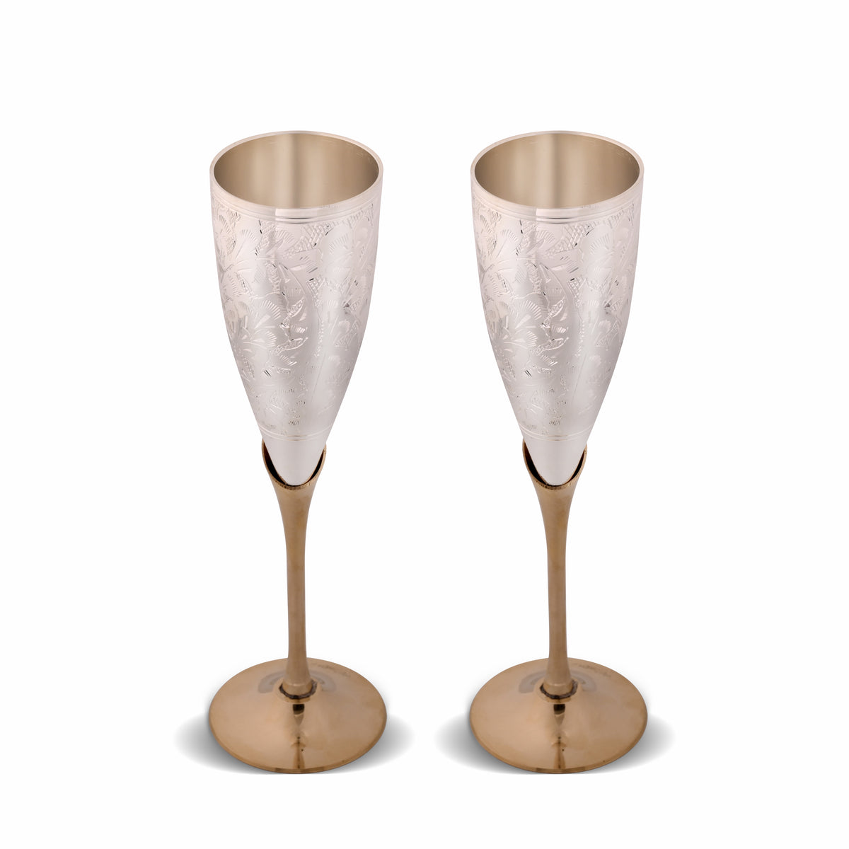 Handcrafted Pure Brass Metals - Raj Gharana Metals pure brass goblet champagne glasses crafted by the experienced Indian artician. Handcrafted champagne flute made with precision indian forging style. which is highly durable and corrosion and stain resistant. Brass Goblet Champagne flute is ideal for daily usage to serve any liquid like baverage wine, champagne, juice and more. Traditional Floral Design - Our brass champagne glass engraved traditional floral desesign, moreover Flutes wine glass set is designed with silver and golden tone with foldable design. Which is durable design utilitarian that is perfect for drinking any liquid. According to Indian science of Ayurveda, Brass products have huge benefits to health like improving the immune system, regulates the body requirement of copper, strengthens bones, helps to cure constipation, support hair growth and more.