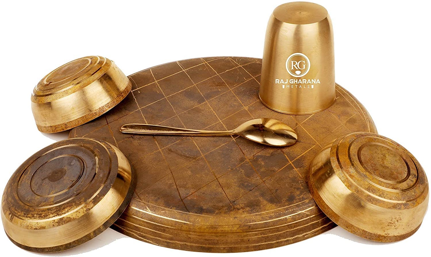Raj Gharana Metals Present New Thali Kansa Bronze Dinner Set-6pc 12 inch Weight – 1.45 KG. It Is The Healing Metal of India – Kansa . The metal Kansa is an alloy of copper and tin. Known in the West as bronze, it was the first of humanity’s metal alloys – and perhaps the most significant. Kansa, or bronze as we would name it, revolutionized the ancient world in many ways. Kansa has many uses; for utensils and implements used in ceremonies.