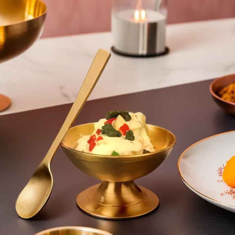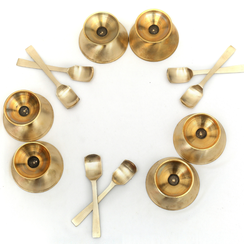 HANDCRAFTED KANSA ICE ICREM SET – Raj Gharana Metals forging precious metal Ice Cream Set and kitchenware item from years of generations, Our Indian handmade bronze dinnerware has been crafted by very skilled and professional artisans which is highly durable and corrosion and stain resistant. It is ideal for daily usage to serve any hot, solid or liquid food, dishwasher safe.